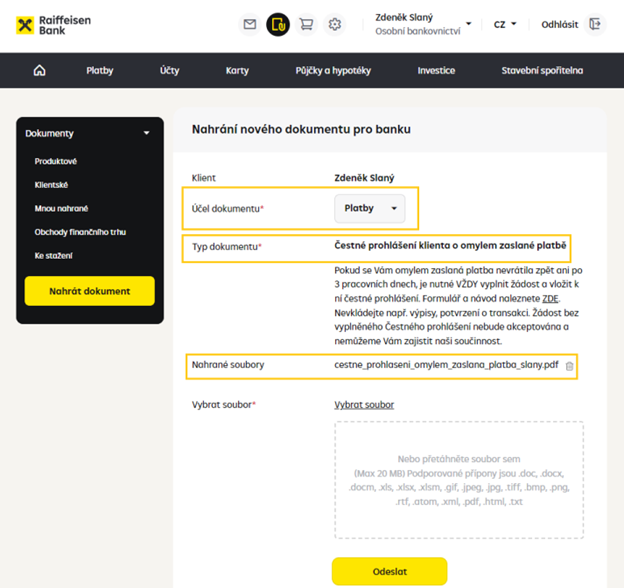 Pokud platba po 3 pracovních dnech nepřišla zpět, požádejte o její vrácení. O vrácení omylem zaslané platby - požádejte jednoduše v mobilním bankovnictví, - nebo vyplňte čestné prohlášení a pošlete nám ho přesinternetové bankovnictví, nebo předejte na pobočce.