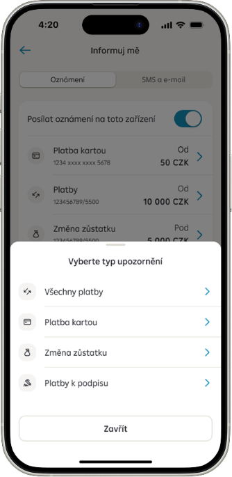 Pro lepší přehled o aktuálním stavu svého účtu si můžete nastavit zasílání zpráv o změně zůstatku na účtu (např. snížení pod částku 100 Kč nebo zvýšení nad 10 000 Kč apod.).